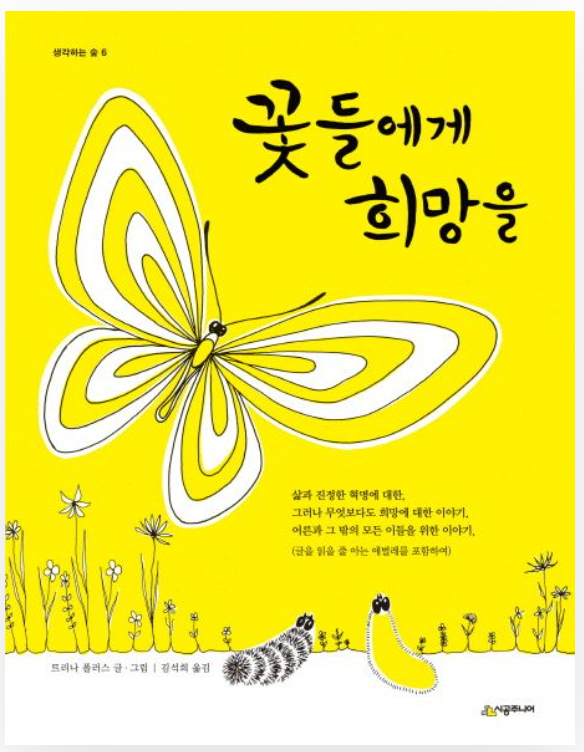 『꽃들에게 희망을』은 세상에 처음 태어난 호랑 애벌레는 '삶의 의미'를 찾아 여행을 시작하는 이야기가 펼쳐진다. 수많은 애벌레가 올라가려는 기둥 너머에 희망이 있을 거라고 생각한 줄무늬 애벌레는 수단과 방법을 가리지 않고 올라간다. 도중에 만난 노랑 애벌레를 만나 사랑에 빠져 다시 땅으로 내려오지만 기둥 너머의 세상을 보지 못한 것을 후회하고 정상에 오를 것을 다짐하고 여행을 떠난다. 노랑 애벌레는 호랑 애벌레가 없어, 삶의 희망을 잃어가던 중 나비가 되면 새로운 삶을 탄생시킬 수 있다는 사실에 나비가 되기로 결심한다. 수많은 사람들에게 희망을 전했던 책으로, 자신의 참모습을 발견하기 위한 끝없는 여정을 비유로 표현했다.